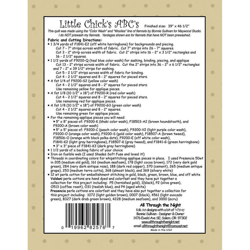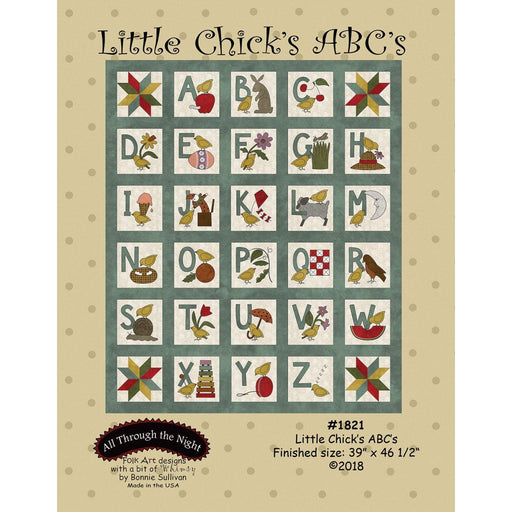 Bonnie SullivanOriginal price $16.00Original price $16.00 - Original price $16.00Original price $16.00Current price $8.99$8.99 $8.99Current price $8.99| /Learn your ABC’s the charming way with Little Chick’s ABC’s by Bonnie Sullivan! This 39" x 46.5" quilt features sweet flannel or wool appliqué chic...